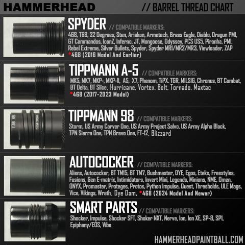 The latest patented design Hammerhead Barrel Adapter Fin Sizer, built upon the (A5 Thread Female To Auto Cocker Male) thread platform to ensure maximum compatibility and versatility. This innovation seamlessly integrates with all branded A5 threaded barrels and can be seamlessly paired with an Auto Cocker threaded paintball marker.